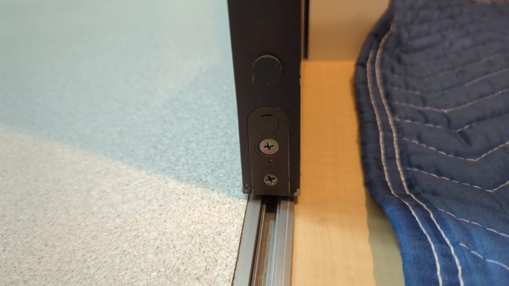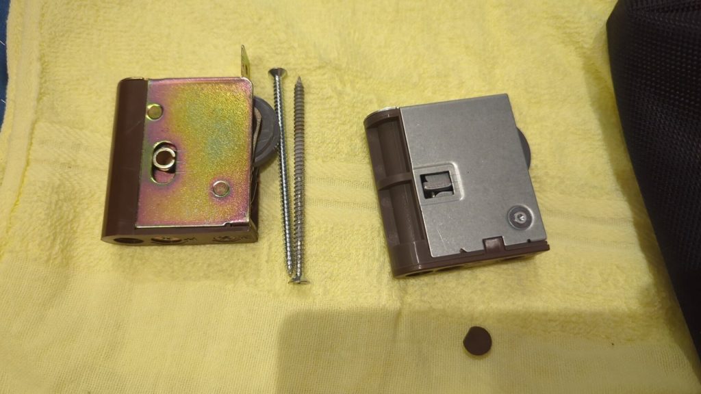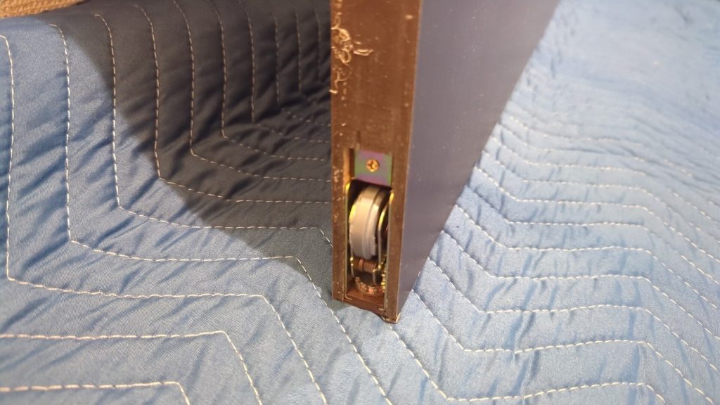 さて作業ですが、扉をおろして戸車を確認しましたが、戸車の高さ調整機構が壊れてしまったため、一番下まで落ちてしまう状態でしたので要交換です。車載品が使えるかなと比べてみると、扉の中に隠れてしまう部分で一部だけ外観が異なる箇所がありましたが、そのほかは寸法もすべて同じでした。なぜこの戸車が車に載っているのかというと、かなり前に2日連続でこれに現場で当たったことがあり、もしや2度あることは3度あるのか?とホームセンターで買ったものの、そのまま使わずじまいになっていた長期在庫品でした。
