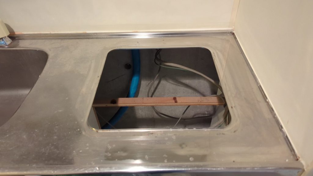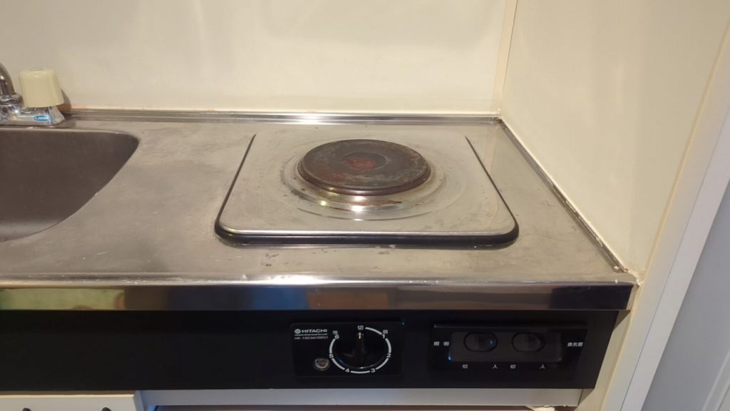 空室で電気コンロからIHコンロへの交換です。このタイプで面倒なのが、ミニキッチンの天板にあいている穴が丸いパターンです。この既設品はもう廃番になっており、今やIHコンロばかりになってしまったので、交換するときには天板をグラインダーなどで切らなければなりません。空室ならまだしも、入居中の場合だと養生するだけで一苦労です。入居中で切らなければならない場合、私はマルチツールを使うことが多いですね。グラインダーの方が早いのですが、粉塵がすごいですから。便利ですよマルチツール!(笑)