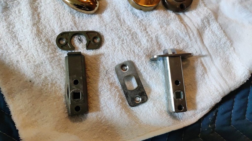 外してみると案の定ラッチケースが割れてましたので、手持ちの新品と交換しました。フロントの角が丸いプレートのみ在庫と形状が異なったので、この部品は再使用します。