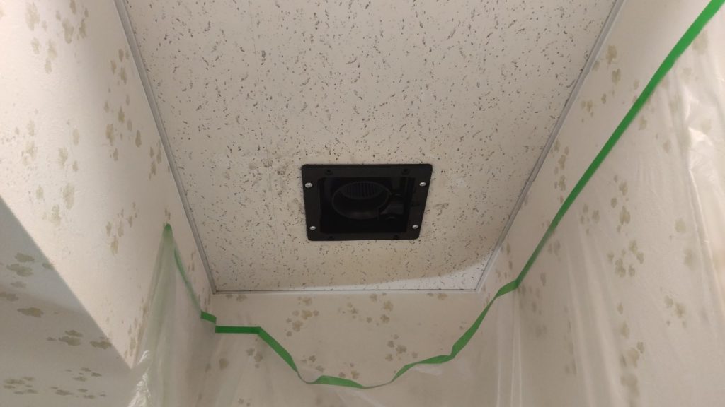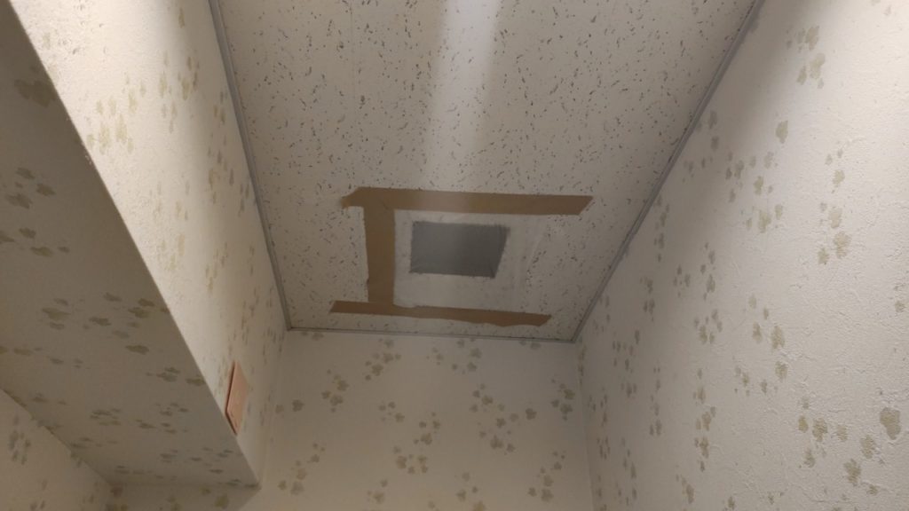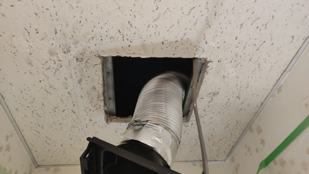 現地に伺うと、換気扇のカバーが外されてビニールで塞がれていました。お手洗いの中に黒い埃のようなゴミが良く落ちているので何かと思ったら、風の強い日に換気扇から降ってくるにに気が付いたそうです。自分で掃除しようと樹脂のカバーを外してみたら、もう掃除でどうにかなるレベルじゃないと思い、管理会社に連絡したとのこと。