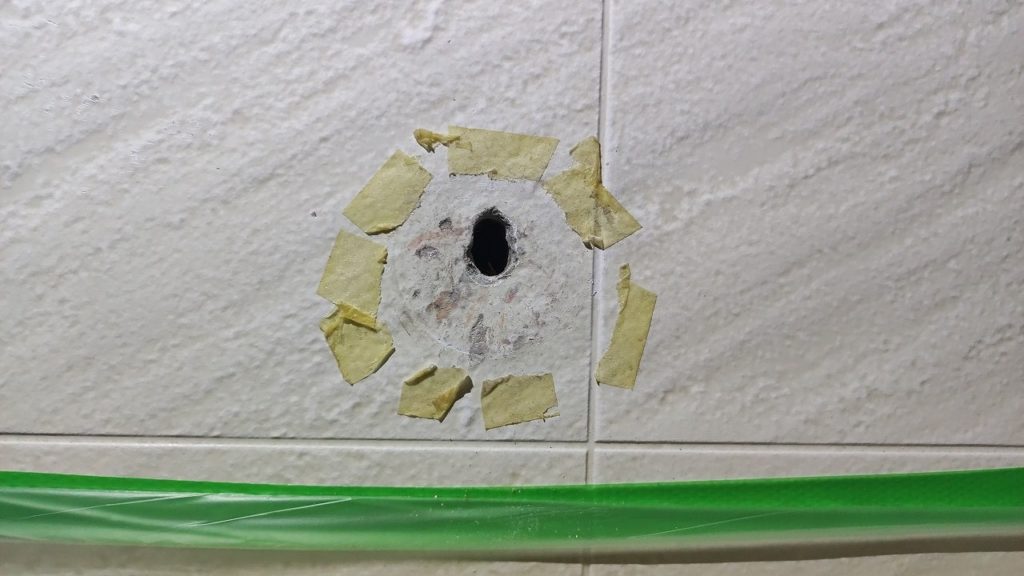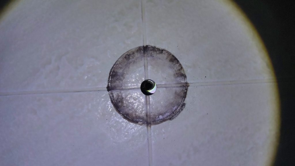 穴が拡がっています。壁の向こうに見えているはずのボルトを受ける金具がなくなっています。ボルトを抜いても脱落しないようになっているはずなんですが…。こうなると新しいアンカーを使って固定するほかありませんが、浴室の壁は薄いスチール板だったり、裏に石膏ボードが隠れていたりと様々ですので、ご自身で修理したいと思ったら壁の材質などに合ったアンカーを使用してください。
