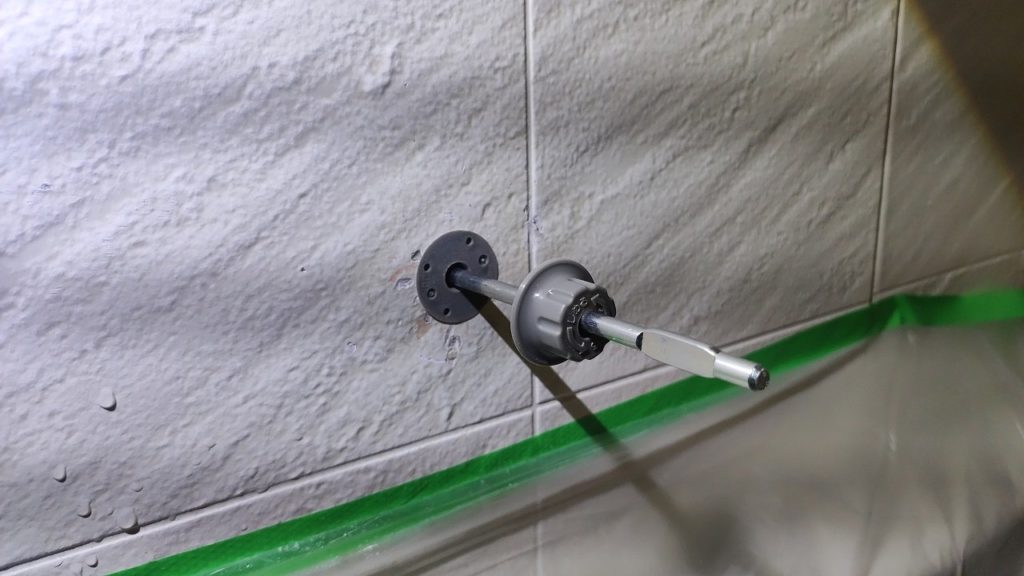 既設品を苦労しながら外してみると、壁の裏側にあるはずのベースが片方なくなっていました。これは想定通りだったので、中空壁に荷重がかかる手すりを設置するための専用のアンカーを用意していたので、そちらを使って新しいものへ交換しました。
