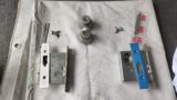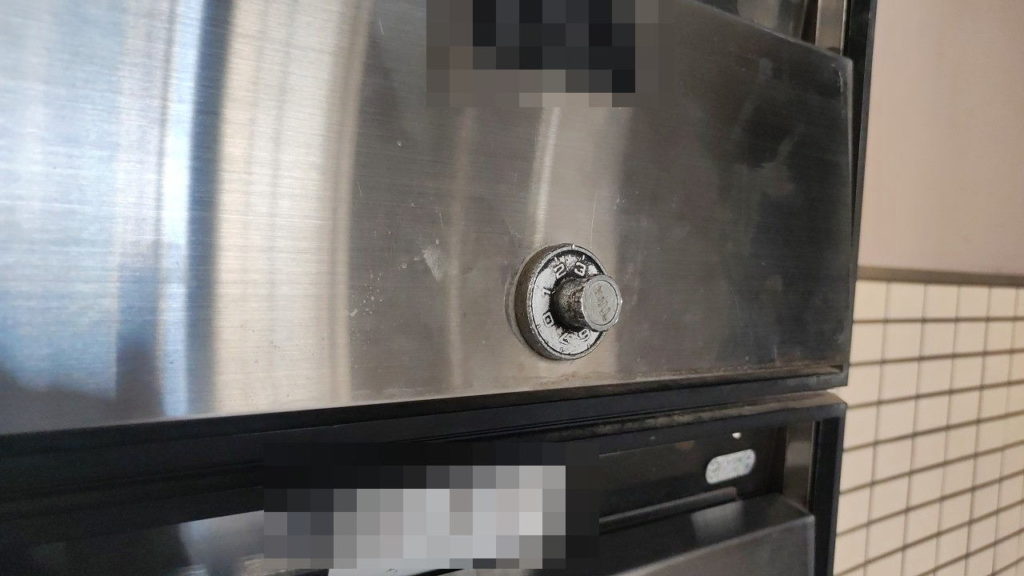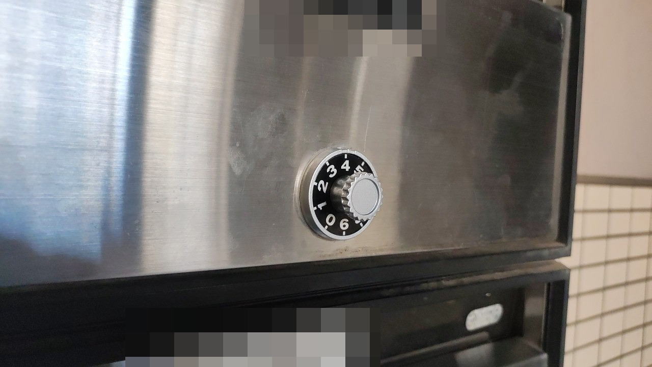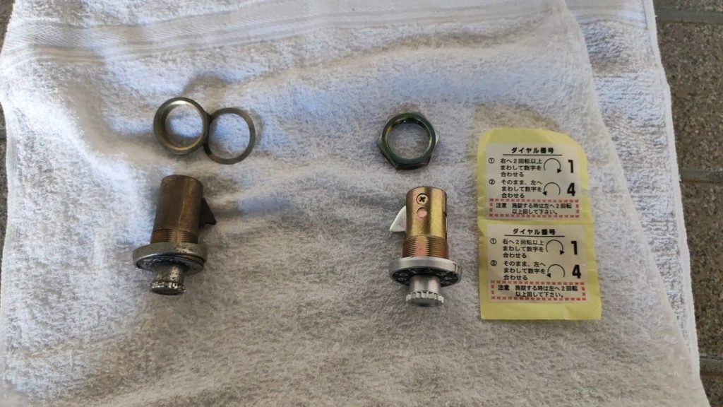 今回のものは、田島メタルワークというメーカーの古いものが付いており、この商品自体はメーカーが既に販売を終了しているのですが、別のメーカーから交換できる部品が販売されています。この案件では、朝日工業のKシリーズというブランドの商品を使いましたが、見た目がメーカーロゴの有無以外は瓜二つです。ほかにもフキという会社がオリジナルのダイヤル錠を販売していますが、こちらもロゴ以外はよく似ていますし、寸法もほぼ同じで交換に使うことができます。